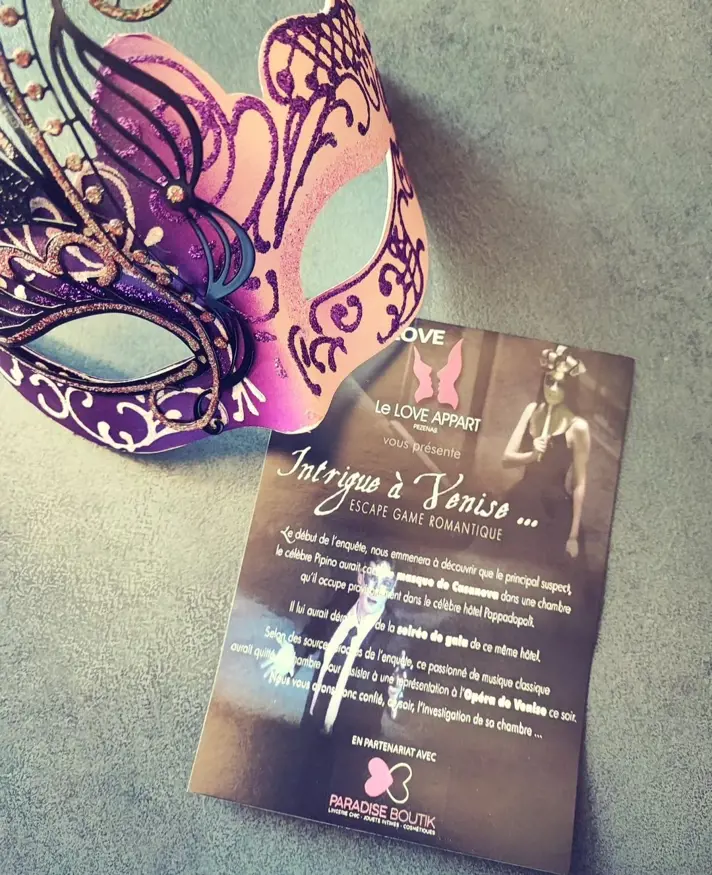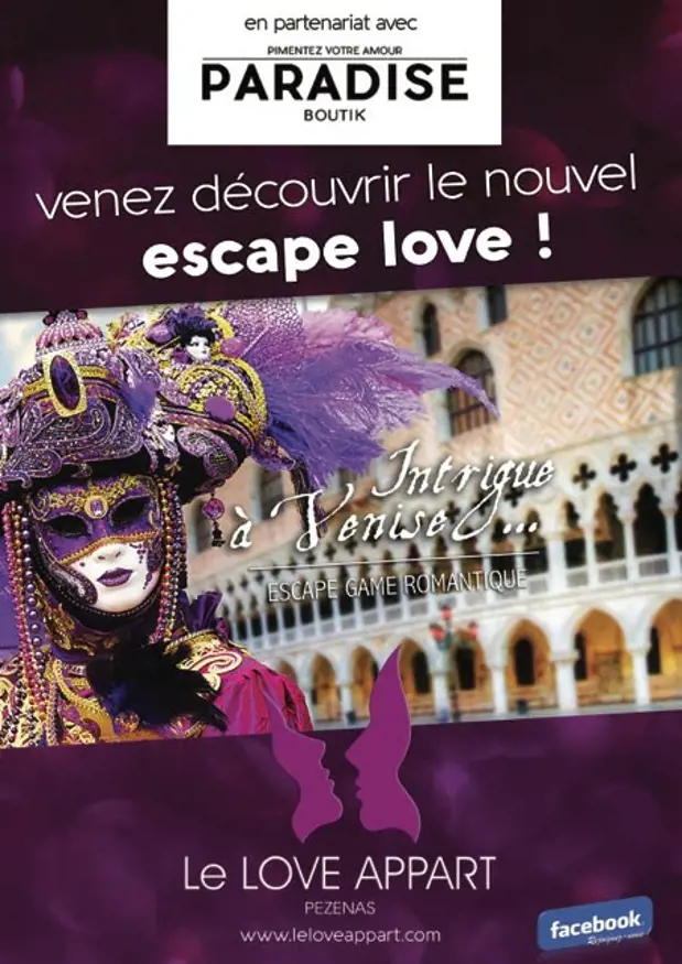 Inédit, une formule "ESCAPE LOVE" romantique vous permettra de pimenter votre séjour insolite, allier le jeu au romantisme sous la thématique de Venise. A l'issue du jeu, une surprise vous attendra si vous arrivez à résoudre l'énigme. En partenariat avec PARADASIE BOUTIK Béziers